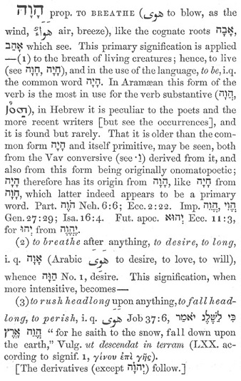 Students might perceive at the Blue Letter Bible links that H1961 (HYH) appears similar to the tetragram; it includes three square Aramaic consonants seen in H3068—although not in exact order—but H1943 (HWH) has the precise initial three letters. Strong’s H3068 allegedly originates from H1961, but that’s from mere conjecture that “I AM THAT I AM” (Exo 3:14) has Yahwistic relevance. The assertion that YHWH stems from the Hebrew word hayah is misinformation; this fallible concordance should instead teach that the “Four Letters” are from HWH—one must append the final Aramaic consonant (י) to hovah to make it Y’hovah (juxtapose H3068 beside H1943). YHWH derives from HWH with a Y (Yod) attached; otherwise, the tetragrammaton would be YHYH. H1961 (hayah) is a common Aramaic word finding application in the Old Testament, but YHWH doesn’t derive from it—the Strong’s Concordance misleads by withholding the connections between YHWH and the word HWH.
